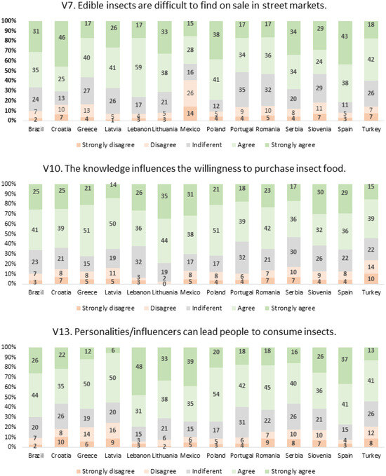 In Figure 5, it presents the results obtained for items that gathered the highest level of agreement globally. For item V7, the results show that EIs are generally difficult to find on sale in street markets, particularly in Lebanon (17 + 59 = 79%), Poland (38 + 41 = 79%), and Spain (38 + 43 = 81%). In what concerns the influence of knowledge in the purchase of EIs (item V10), highest agreement was found for Lithuania (35 + 44 = 79%), Greece (21 + 51 = 72%), and Poland (21 + 51 = 72%). Finally, the results for item V13 revealed that, in Lebanon (31 + 48 = 79%) and Spain (41 + 37 = 78%), the highest percentages of agreement were found for the influence of personalities and influencers in encouraging the consumption of EIs.