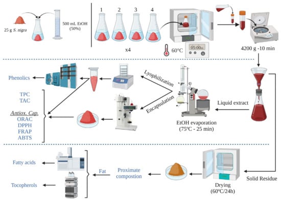 Therefore, complete information about the bioactive and valuable compounds present in elderberries is necessary for the rational and integral use of elderberries. The present study proposes not only the characterization of elderberry extracts but also to evaluate the potential of the solid residue resulting from the extraction of phenolic compounds and to fully value all parts of the berries. Currently, there is no study that comprehensively evaluates all potentially extractable bioactive compounds from elderberries, including those retained once the anthocyanins and other polyphenols are extracted. Consequently, the present work has several specific objectives, which include the complete characterization of the hydrophilic compounds extracted from elderberries, the characterization of the lyophilized and encapsulated extracts, the recovery of the resulting solid residue and its chemical analysis, as well as the characterization of the main lipophilic bioactive compounds (fatty acids and tocopherols) retained in the solid residue with the potential to be extracted and used in the food industry. Moreover, the results presented in this manuscript can be used in the development of new and innovative functional ingredients for food applications. In summary, the main objective of the present study was the complete characterization of the main lipophilic and hydrophilic bioactive compounds that can be obtained from elderberries, as well as the encapsulation of hydrophilic compounds.