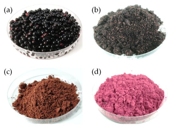 Visual appearance of fresh elderberries (a), freeze-dried elderberries (b), solid residue after extraction (c), and encapsulated extract (d).