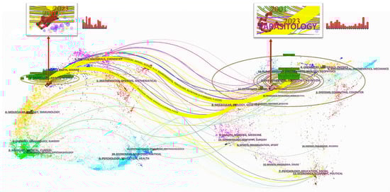 The red dotted line in the enlarged figures at the top of the dual map diagram represents the dynamic changes in the disciplines of citing and cited journals since 2001. The published literature existed as part of the veterinary/animal/science discipline from beginning to end, and the current research hotspot has been concentrated in the discipline of veterinary/animal/science. Concurrently, the disciplines of the cited journals fluctuated repeatedly from 2001 to 2022, but the subject remains in the discipline of veterinary/animal/parasitology, which was almost consistent with the dynamic change in the citation discipline. This suggests that both the citing literature and the cited literature had a certain degree of stability.