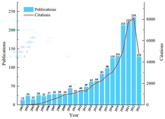 For the visual analysis in this study, Citespace 5.8.R3c and VOSviewer 1.6.18 were employed. Origin 2022 and Scimago Graphica 1.0.17 were used to create visual representations, while data statistics were conducted using Microsoft Excel 2019. Within the scope of this study, various plots and visual representations were created using different software tools. For example, origin software 2022 was employed for plotting the annual publication volume and citation trends. Citespace software was used to analyze and generate the journal double citation map, co-citation journal clustering map, and co-citation journal timeline map. For specific drawing methods, see the research of Citespace developer Chen [,]. VOSviewer aided in creating the keyword spatio-temporal map and keyword clustering hotspot map []. The network visualization map of inter-country cooperation was jointly analyzed and generated using VOSviewer and Scimago Graphica. The specific procedures involved regions belonging to the same country were merged by VOSviewer (e.g., Taiwan, Hong Kong, and Macau were represented by the People’s Republic of China; Northern Ireland, Scotland, and Wales were represented by England), and Scimago Graphica was used to create the network visualization map. Furthermore, the rest of the tables were drawn using Excel statistics.