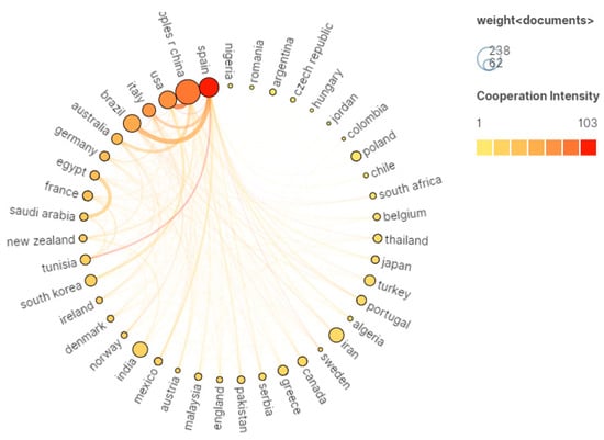 The number of publications and amount of international cooperation among countries are illustrated in Figure 3. In this visual representation, each circle represents a specific country, with the size of the circle corresponding to the number of publications from that country []. Additionally, the connections between circles denote cooperative relationships between the respective countries.