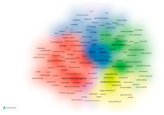 Cluster label mapping of keywords in the field of meat preservation, obtained using VOSviewer.