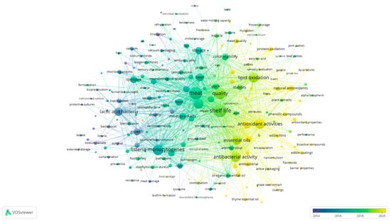 We then created a density network diagram of the keywords, as seen in Figure 5, where the color gradient from left to right signifies the evolving emphasis on these keywords over time. Blue represents earlier research in this field, while yellow indicates the current research frontier []. In the field of meat research, a large number of detailed and in-depth research has been carried out on the physical and chemical properties of meat, as well as on microbial indicators and representative microorganisms in meat. Furthermore, by observing the size of the circles representing keywords, it was found that the current research hotspots include lipid oxidation, active packaging, antibacterial activity, essential oil preservation, film preservation, and so on. For example, Borzi et al. (2019) conducted a study in which they prepared antioxidant polyamide active packaging films through leaching. They observed that these active packaging films effectively prolonged the storage period of pork, extending it up to 23 days, while also significantly reducing fat oxidation []. Xavier et al. (2021) prepared cinnamon essential oil into nano-microcapsules and then combined it with corn alcohol solution to make active packaging for beef preservation, which effectively extended the shelf life of the beef and delayed fat oxidation [].