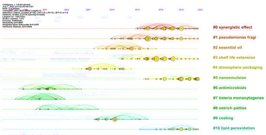 Timelines of cluster labels of co-cited documents in the field of meat preservation, obtained using CiteSpace.