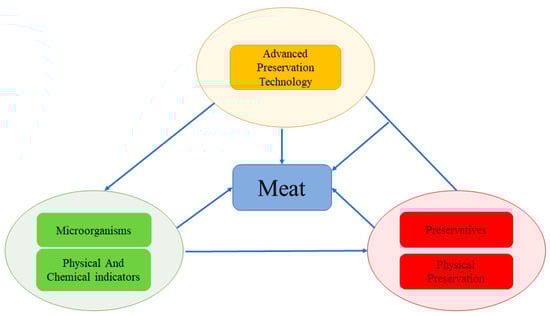The red section constitutes the foundation of the core research in this field. The selection of different preservatives and methods is based on different types of meat and different storage methods. Within this category, research is bifurcated into two main aspects: the development of preservatives on one front, and the application of physical preservation methods (such as refrigeration, freezing, vacuum packing, and air conditioning) on the other. Notably, biological preservatives with antibacterial and antioxidant properties are more favored by researchers. For instance, Liu et al. (2020) used clove essential oil to preserve Yao meat, which offered antibacterial and antioxidant effects and imparted a distinctive flavor, thus leading to a reduction in the quantity of spices required []. Subsequently, researchers have integrated technologies from the orange segment to jointly explore meat preservation. In these studies, various advanced techniques, including near-infrared spectroscopy [], chromatography [], high-throughput sequencing [], histology [], high-pressure homogenization [], pulsed electric fields [], and magnetic fields [], are applied to assess the physical and chemical parameters of meat, microorganisms, and preservation methods and agents. These technologies have played a pivotal role in advancing the research discipline of meat storage and preservation. As depicted in Figure 7, all the components are interconnected and mutually reliant. Basic research serves as a guiding force for the advancement of research techniques, and conversely, the application of research techniques propels the deepening of the theoretical foundation.