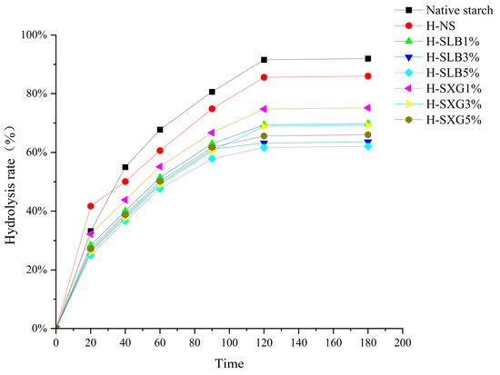 The RS content of H-SHC exhibited a positive correlation with the amount of colloid addition. However, the difference between 3% and 5% colloid addition was not significant. This may be attributed to a saturation point where a certain amount of colloid interacted fully with the starch, and excess colloid did not provide additional protection for H-SHC. Notably, the RS content of H-SLB was slightly higher than that of H-SXG, primarily due to locust bean gum’s superior hydrophilicity compared to xanthan gum. This observation aligns with the SEM results, which revealed differences in colloid adhesion to the starch. It further supports the notion that colloids in H-SHC encapsulate starch granules, hindering the contact between digestive enzymes and starch, thus protecting the starch granules, inhibiting enzymatic action, and ultimately increasing RS content. Additionally, hydrophilic colloids limited enzyme access to starch by increasing sample viscosity and promoting high water utilization, thereby reducing the rate of starch hydrolysis [32]. Moreover, the high viscosity of the gel reduces the activity of hydrolysis products, resulting in localized high product concentrations that inhibit digestive enzyme activity [33]. Slaughter et al. [34] demonstrated that hydrophilic colloids exhibit some affinity for a region of α-amylase, leading to non-competitive inhibition with starch.