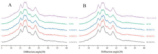 XRD patterns of natural starch and HMT samples: (A) XRD spectrum of H-SLB; (B) XRD spectrum of H-SXG.