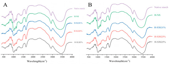 Infrared plots of natural starch and HMT samples: (A) IR absorption spectra of H-SLB; (B) IR absorption spectra of H-SXG.