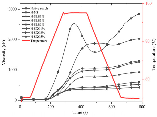 To perform the HMT of the samples, hydrophilic colloids (0 g, 0.1 g, 0.3 g, 0.5 g) were dispersed in 100 mL of deionized water and stirred in a water bath at 90 °C for 30 min. After cooling to room temperature, 10 g of starch (dry basis) was added and stirred for an additional 30 min. The samples were subsequently dried at 45 °C, pulverized to pass through a 100-mesh sieve, and their moisture content was adjusted to 25%. The samples were allowed to equilibrate for 24 h at 4 °C. They were then subjected to treatment in a reactor (KH-200 Kuncheng Co., Shanghai, China) at 120 °C for 5 h. After cooling to room temperature, the samples were stored at 4 °C for an additional 24 h. Finally, the samples were dried in an oven at 45 °C for 24 h, crushed through a 100-mesh sieve, and sealed in containers for storage.