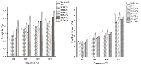 The swelling power and solubility of natural starch with H-SHC samples at temperatures of 60 °C, 70 °C, 80 °C, and 90 °C are depicted in Figure 6. The swelling power of all samples increased as the temperature rose. However, the swelling power of natural starch decreased following HMT treatment, which aligns with findings from previous studies [35]. This decline can be attributed to alterations in the morphology, composition, and interactions of the starch granule components. It is also associated with increased interactions between straight-chain and branched-chain starch molecules, leading to strengthened intramolecular bonds [14]. Furthermore, the decrease in swelling power can be attributed to enhanced interactions between straight-chain and branched-chain starch molecules, the formation of straight-chain starch–lipid complexes, and changes in the arrangement of starch crystallization regions [13]. Additionally, HMT treatment can make the granules stiffer, heat-resistant, and confer greater hydrophobicity to them [48]. As observed in Figure 6, the swelling power of H-SHC increases with a higher hydrophilic colloid content. For natural starch, starch granules aggregate when hydrophilic colloids cover the granule surface, interacting with the small amount of straight-chain starch on the granule surface. Notably, xanthan gum has a more significant inhibitory effect on the swelling power of starch granules compared to locust bean gum, possibly due to the higher hydrophilicity of locust bean gum, making it more soluble in water and thus leading to the rapid swelling of starch. However, at sufficiently high temperatures, xanthan gum also dissolves in water. Additionally, in the HMT process, straight-chain starch and branched-chain starch form new crystals in the amorphous region of the granule, further inhibiting starch swelling at high temperatures.