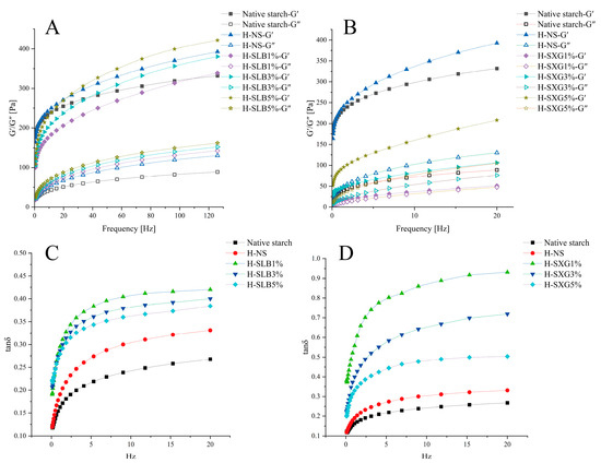 Dynamic rheological properties of natural starch and HNT samples. (A) G′, G″ of H-SLB; (B) G′, G″ of H-SXG; (C) tan δ of H-SLB; (D) tan δ of H-SXG.