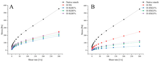 Static rheological properties of natural starch and HMT samples: (A) stress of H-SLB; (B) stress of H-SXG.