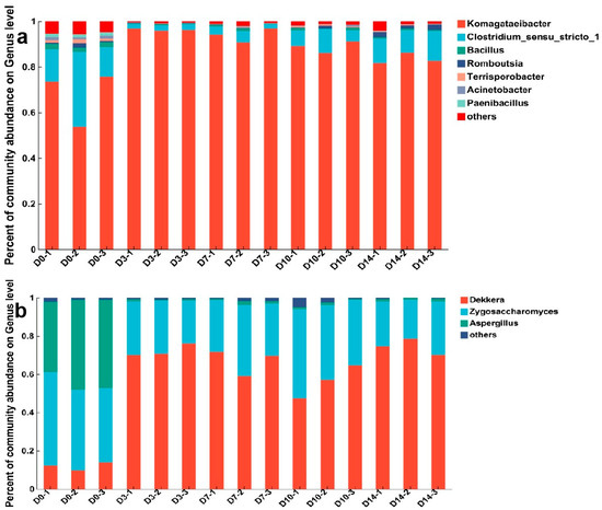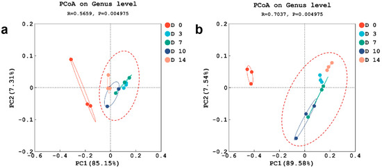 PCoA was performed to compare the difference in the microbial community during the kombucha fermentation from different time points (Figure 2). The two principal coordinate axes explained 92.46% of bacterial total variation and 97.12% of fungal total variation (Figure 2a,b). Regarding both bacterial and fungal communities, the samples collected on the 0th day formed a distinct cluster, while those from the 3rd, 7th, 10th, and 14th days were grouped separately. Zhang et al., demonstrated that some factors could influence the abundances of microbiota throughout the fermentation process [32]. Therefore, the PCoA results in this study indicated that the environmental factors after 3 days were quite different from the start point. Combined with the results and discussion of community composition, the possible factors affecting FBT kombucha could be pH and dissolved oxygen. Future studies about the possible factors affecting kombucha fermentation will enhance our understanding of the mechanisms governing microbial dynamic changes and offer possible strategies for controlling microbial abundance.