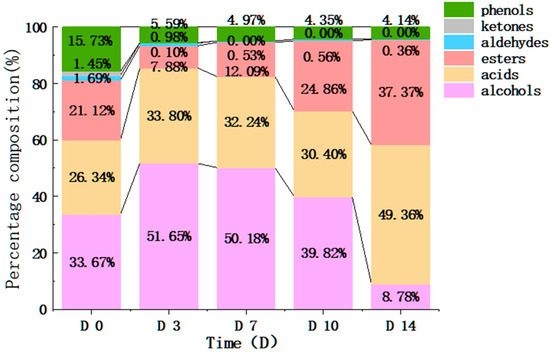 Overall, 26, 26, and 24 volatile flavor components were identified in kombucha on the 7th, 10th, and 14th days of fermentation, respectively. During this fermentation period, there was a continuous increase in the concentration of acid and ester compounds (Figure 3). On the 7th day of kombucha fermentation, the concentration of alcohols was the highest, accounting for up to 50.18% of all volatile components. On the 14th day, the concentrations of acids and esters were the highest, accounting for up to 49.63% and 37.37% of all volatile components, respectively. It was speculated that in the mid-to-late fermentation stages, alcohols and acids form esters under the action of microorganisms [36].