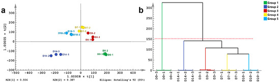 The OPLS-DA and HCA during the fermentation of kombucha made from FBT. (a) OPLS-DA. (b) HCA.