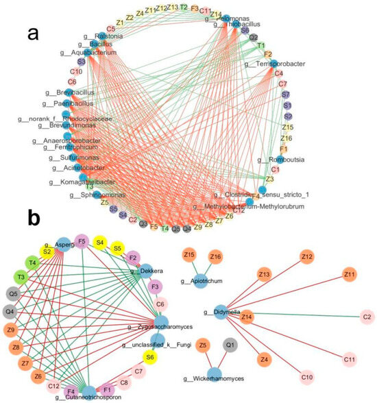 Correlation analysis between microbial genera and volatile compounds during the fermentation of kombucha made from FBT. (a) The bacterial genera. (b) The fungal genera. The red lines indicate a positive correlation, and the green lines indicate a negative correlation.