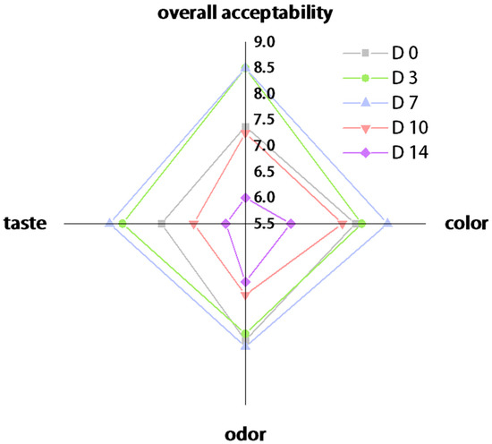 The sensory properties of the kombucha samples were determined using a 9-point scale method according to a descriptive analysis technique [25]. Each kombucha sample from a different time (Day 0, 3, 7, 10, and 14) was subsequently coded with numbers and evaluated in triplicate for overall acceptability, appearance, color, odor, and taste. Scores ranged from 1 to 9, as follows: (1) extreme dislike, (2) great dislike, (3) moderate dislike, (4) slight dislike, (5) neither liking nor dislike, (6) slight liking, (7) moderate liking, (8) great liking, and (9) extreme liking. The kombucha samples were evaluated by a selected and semi-trained sensory panel of 10 testers.