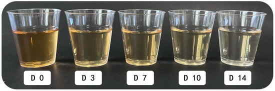 The sensory characterization of the kombucha samples was performed during the fermentation period (Figure 6). The kombucha sample from the 7th day was the most preferred beverage in terms of all sensory characteristics, and the contents of ethanol and glucuronic acid were the highest (Table 2), which provided higher functional properties. It can be observed that the color of the sample was a yellow hue and became lighter and clearer as the fermentation time increased (Figure 7). This phenomenon may be caused by microbial activity degrading certain substances [43]. According to previous studies, it has been observed that the color of Kombucha tea prepared with black tea changes from reddish brown to light brown during fermentation, which is attributed to the conversion of polyphenols, primarily theaflavin and thearubigin [7]. The main polyphenols found in FBT are theaflavins, thearubin, and theafuscin [44]. Therefore, it can be speculated that the color change in FBT kombucha is also caused by the alteration of these polyphenols.