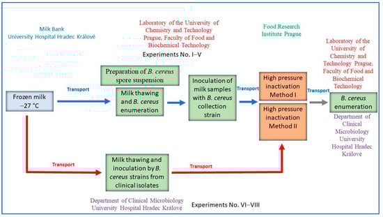 In our work, we used the findings of Demazeau et al. and Fekraoui et al. and verified the effectiveness of these methods on a larger data set [,]. In the case of pressurization in cycles, we also analyzed the effectiveness of the method for inactivating spores after each completed cycle. For testing in eight separate experiments, isolates of B. cereus came directly from breast milk (28 samples from the University Hospital Hradec Králové—UH HK), and also from the Laboratory of the University of Chemistry and Technology Prague (80 samples, a collection strain of B. cereus CCM 869 (WDCM 0001)), Faculty of Food and Biochemical Technology (UCT). Control blanks were prepared for each experiment. Figure 1 shows the algorithm of the entire set of experiments. A total of eight experiments were conducted, whereas experiments No. I–V were performed with milk inoculated at UCT and experiments No. VI–VIII were carried out with milk inoculated at UH HK.