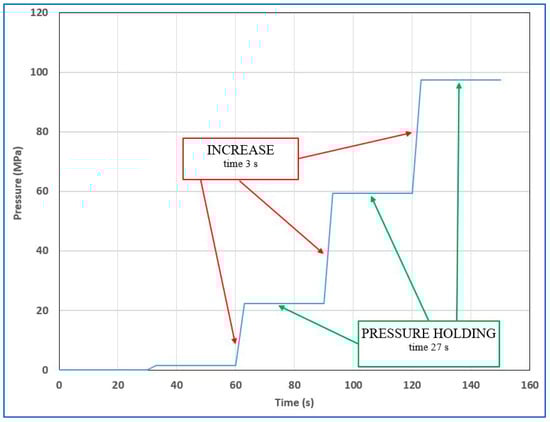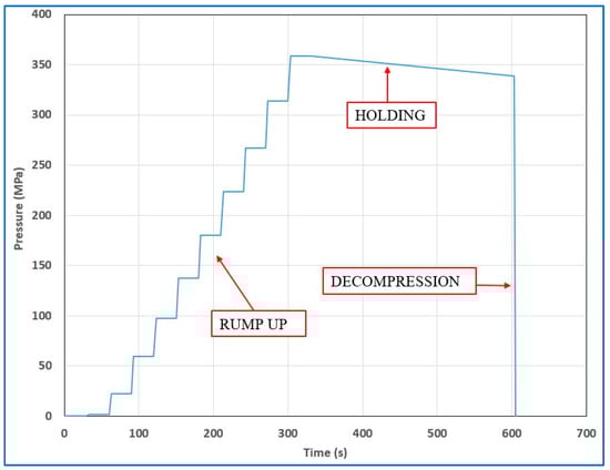 The samples were subjected to increasing pressure for approximately 5 min during each cycle. After reaching a pressure of 350 MPa, there was a 5-min hold, followed by rapid depressurization. The entire cycle, each lasting 10 min, was repeated four times. The sample was then cooled to 5–8 °C and sent for analysis. Figure 4 shows, in detail, the pressure changes during one cycle, without a pause after decompression. Figure 5 illustrates, in detail, the pressure increase during the first 5 min of the cycle, i.e., pressure was increased in 3-s increments, followed by a 27-s period of equalization. An equalization period was included to achieve an overall average pressurization rate of 1 MPa per second. (Note that Figure 4 only shows the pressure changes during the first 2 min of a single cycle).