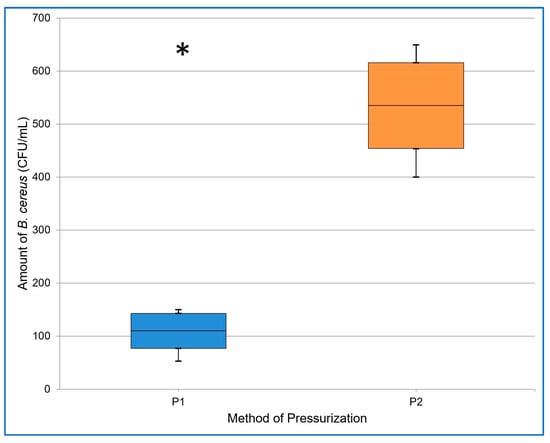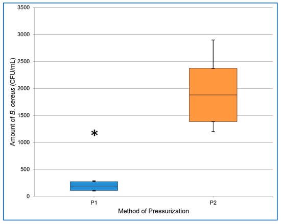 The resulting amount of B. cereus (CFU/mL) after applying pressure in cycles (P1) and continuous pressure (P2) in experiment I. The midline of the boxplot denotes the mean, the top line + SD, the bottom line—SD, and the whiskers denote the maximum and minimum values. The asterisk indicates the statistically significant results.