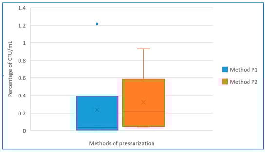 We also selected six representative samples from the entire data set for which a complete set of measurements was performed, and we determined the percentage decrease in B. cereus (CFU/mL) compared to the nominal value (Table 3). We demonstrated that both methods led to statistically significant decreases in microbial contaminants (α = 0.017, p = 0.365). The slightly higher efficiency of pressurization cycles, i.e., method P1, is shown in Figure 8, which, however, was not found to be statistically significant.