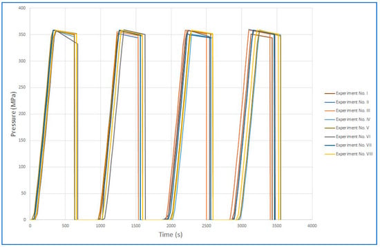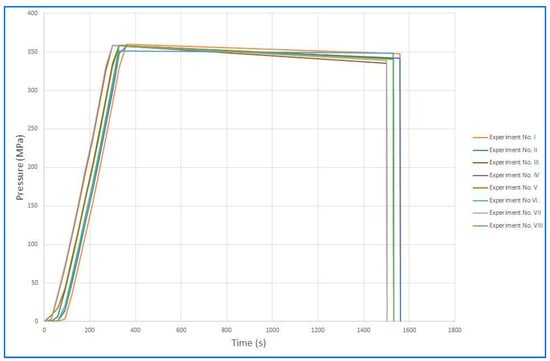 Figure 9 and Figure 10 show the time courses of pressurization in summary for all runs. Figure 9 is a graph of the pressurization cycles and Figure 10 shows continuous pressurization. The figures show that the time courses of the individual pressures were comparable in repeated experiments. Individual graphs of each experiment are presented separately in the Supplementary Data File. The beginning of each cycle cannot be the same due to the design of the device, which depends on where the multiplier piston stopped during the previous pressurization cycle.