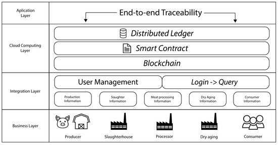 Based on the traceability requirements for the food chain and the problems that the application scenario presents, a conceptual framework was developed for an end-to-end traceability system in the food industry, which can be represented by Figure 3.