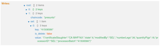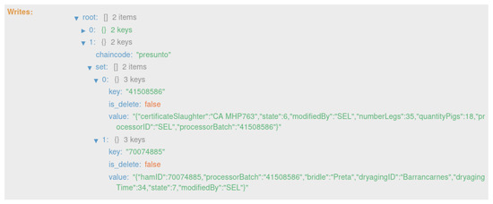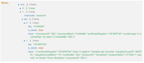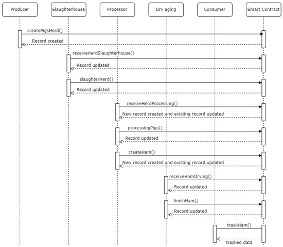 When the consumer wants to query the product information using the system based on the proposed architecture, there must be records of all the processes that product has undergone. For the presented scenario, the information to be collected goes beyond the change in owner or state since end-to-end traceability must include external and internal traceable information in order to be complete. In the case of the proposed work, the product undergoes a transformation during its life cycle, going from pork to ham. However, the ham, or leg, is not the only piece from the pork processing process, so it becomes necessary to create a middle ground between the pork and the ham, which is capable of recording all the pieces. This implies that a record is created at the time of the processing.