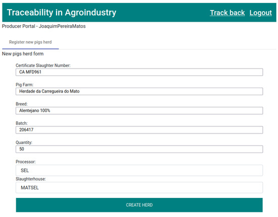 - Producer: These types of users are animal producers. In order for the traceability process to be correct, the origin of the product must always be registered first; therefore, it is the first user to appear in the supply chain, being the only one who can create new records of the “Pigs herd” type.