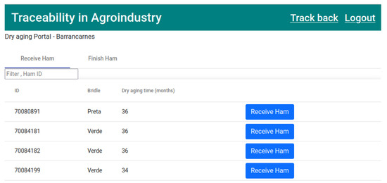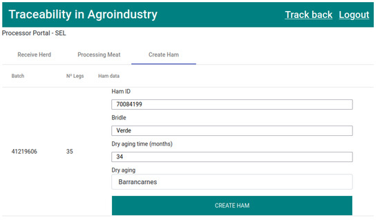 Finally, the last stage of the product life cycle corresponds to the finalization of the ham. The dry aging company keeps the ham on its premises for a period of time (“Dry aging time”) until the ham is cured. When the ham is ready for sale, the dry aging company can go to the “Finish Ham” tab and finish the drying process. Simultaneously, the traceability process of the ham in question is finalized, as represented in Figure 19.