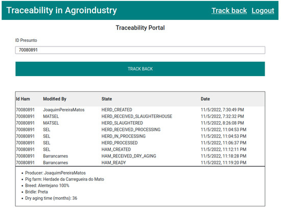 Once the ham is in the consumer’s possession, the consumer can access the traceability portal and enter the identifying number that accompanies the ham in the search bar. As shown in Figure 20, the information collected throughout the production cycle will be displayed, showing its origin and the processes to which it has been subjected.