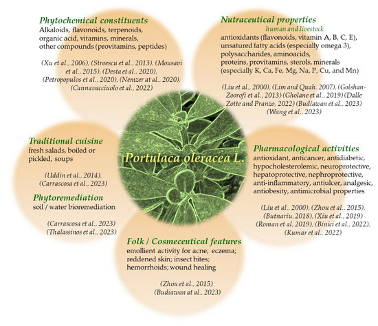 Purslane has been extensively studied under a phytochemical point of view with the aim of providing scientific value to its folk (and ancient) medicinal uses and understanding the bases of nutritive role factors and pharmacological properties [5,10,11,12,13]. The presence of polysaccharides, flavonoids, alkaloids, fatty acids, terpenoids, sterols, proteins, vitamins, and minerals has been detected in this plant [7,11,14,15,16,17,18]. These constituents give purslane a high nutritional value, directing it towards the production of food supplements on an industrial scale. Many research studies are also underway on purslane as feed for farm animals for positive actions on reproductive factors [19,20] and the quality of farm products [21]. Furthermore, the plant possesses a wide spectrum of pharmacological properties, such as neuroprotective, antioxidant, anticancer, antidiabetic, hypocholesterolemic, hepatoprotective, nephroprotective, anti-inflammatory, antiulcer, analgesic, antiobesity, antimicrobial, and wound-healing activities [8,10,11,22,23,24,25,26]. Efficacious use of purslane in phytoremediation applications is also proven [3,27]. Figure 1 summarizes the phytochemical components, uses, and nutritional and pharmacological activities of purslane along with recent literature references.