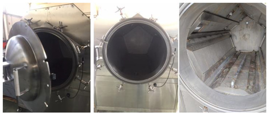 With the aim of processing large amounts of purslane weed, the drying process was also conducted using a non-commercial pre-pilot microwave applicator. This pre-pilot apparatus was purposely designed and realized (EMitech Srl Company, Corato—Bari, Italy) to work at variable power levels and also in vacuum conditions due to the need to operate with herbs and spices, following the approaches of many literature studies [40,41]. In brief, the built-up pre-pilot apparatus presents a drying camera of 2 m3 built in stainless steel; it is equipped with 8 magnetrons at 1.5 kW (maximum power 12 kW) and a vacuum liquid ring pump (aspiration rate: 110 m3/h; vacuum guarantee: 940 mbar). Electromagnetic field homogenization is assured by the reflection phenomena promoted by the pentagonal section of the process camera. In Figure 3, several photos of the prototype are shown.