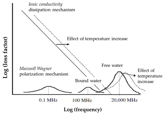 As introduced, for agricultural purposes, microwave processing technologies have gained interest in postharvest operations for disinfestation, drying, and cooking treatments for use as proven, efficacious approaches to stabilize and prolong the shelf life of agro-foods (fruits, vegetables) that are susceptible to degradation due to the presence of natural infesting fauna [44,45] and enzyme activities. Moreover, the interest in this technology is promoted by the extensive research work on microwaving’s effects on food quality attributes in terms both of nutrients preservation and sensory features [32,40]. The success of the technology is due to the peculiar mechanism for energy transfer, which is particularly suitable for high-water content matrices such as agro-foods. In conventional heating processes, energy is transferred to a material by transport phenomena (convection, conduction, and radiation) that are driven by thermal gradients and through the external surface of treated materials. In contrast, microwave energy is directly delivered to materials through molecular interactions (named “loss mechanisms”; Figure 4) with an electromagnetic field via the conversion of electromagnetic energy into thermal energy (dielectric heating). When loss mechanisms take place, high rates of heating and efficiency of energy conversion are expected. These latter features represent the key point of microwave heating because the method makes it possible to accomplish in short times what would take a long time to accomplish with conventional heating (conductive and convective heat transfers). Indeed, this depends upon the slowness of the heat delivery rate from the material surface to the core as determined by the difference in temperature from a hot outside to a cool inside and by the thermal features of the materials (thermal conductivity and thermal diffusivity, which is in general very poor for the foods). In contrast, the use of microwave energy can allow, under some conditions (see penetration length), for bulk heating, with the electromagnetic field interacting with the material as a whole. The main results of this evidence are the possibility to reduce the heat degradation of materials and to reduce energy requests, making the thermal treatments performed by microwave heating intensified operations. It is important to highlight that process intensification (PI) is the modern industrial approach for developing equipment miniaturization and responsible–sustainable methods to enhance mass, heat, and momentum transfer rates to improve safety, scale-up procedures, and exploitation of resources, especially with respect to energy [46]. Electromagnetic interactions of energy–matter are due to the ability of the electric field to polarize elementary matter charges, and to the impossibility of the induced dipoles to follow the rapid changes of the oscillating electric field (thus, loss; or, more properly, dielectric dissipative mechanisms). Different kinds of polarization mechanisms are possible [33,35]; the dipoles rotation is the dominant polarization mechanism in irradiating materials rich in water (such as biological tissues, foods) in the microwave electromagnetic spectrum region (industrial high frequency heating 107 < f[Hz] < 109). Moreover, in the same frequency region, if ionic species are present in materials, further dissipative phenomena by ionic conduction (Joule’s loss effect) may occur.