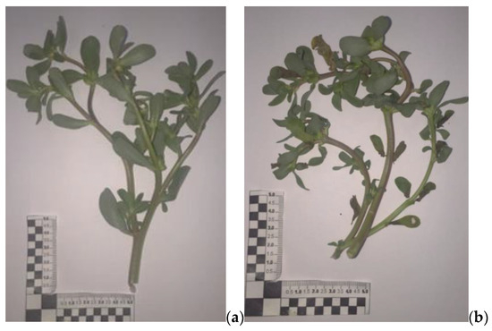 Vegetal purslane structures are extremely heterogeneous (Figure 2), and this, from a technological point of view, constitutes a limit due to the different behavior of tiny parts (leaves, fruits, and seeds, with linear dimensions/thicknesses of a few millimeters), stems, twigs, and branches (length and thickness over centimeters) in conducting heat and mass transport during the drying process. In detail, purslane is glabrous, enlarged and fleshy, branched, smooth, hollow, and often reddish and it has prostrate-creeping stems of 10–40 cm. Its leaves, which are petiolate, are light green in color; they are also fleshy and glabrous like the stems, alternating with a spatulate form and truncated apex. In the axils of the leaves, solitary or in groups of 2–5, small and inconspicuous five-petal yellow flowers are present. These are open for a few hours in the morning (at sunny conditions). The fruits are compressed, fusiform, membranous capsules containing many seeds. These are tiny, black, glossy, oval-shaped seeds, about 1 mm in size, that can remain viable in the soil for 20 to 40 years. Seed germination occurs when the soil temperature exceeds 25 °C with an optimal temperature requirement of 30 °C [9].