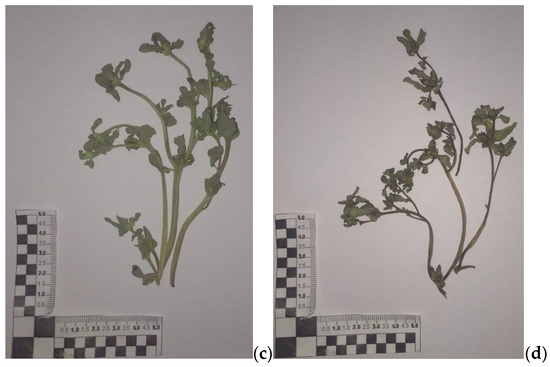 Samples underwent convective treatments (CD1, shade drying and CD2, hot air drying) and have shown that, under the imposed conditions, the dehydration end points that are not suitable for a safe stability. In particular, purslane samples after several days at room condition manifested clear traces of degradation, including the development of infestants. When prolonged in a hot air (CD3) well, dried products were obtained. In Figure 5a–d and Figure 6, photos of fresh and dried purslane samples are presented to show, even if only as a qualitative manner, the shrinkage levels and color changes, confirming evidence in the literature for the hot-air drying of herbs [32].