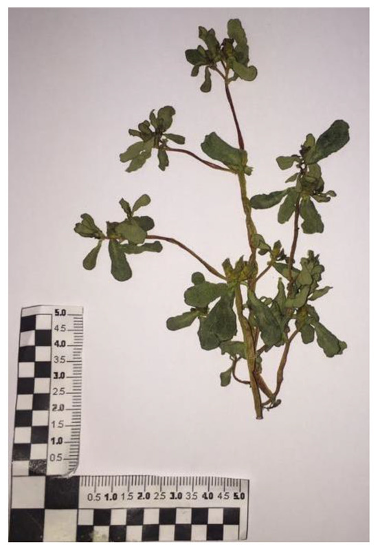 Purslane (Portulaca oleracea L.) was collected at the farm of the agricultural company Caselle Società Agricola (site in Pontecagnano, Salerno, Italy) in July 2021 (June–July 2021; average temperatures and humidity: 26.6–28.8 °C; 53 RU%, respectively) from a natural spontaneous population (GPS: 40°63′77.2” N, 14°86′59” E). The plant was identified by Prof. Vincenzo De Feo. A voucher specimen, labelled as DF/2021/289, has been deposited at the herbarium of the Medical Botany Chair of University of Salerno. Figure 2 reports a photo of the collected fresh purslane.