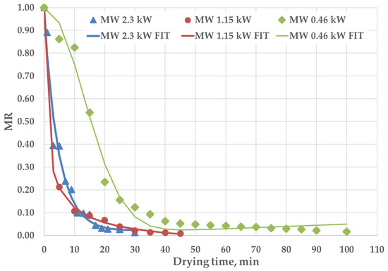 Drying curves at the explored microwave output powers. Solid lines represent best-fit lines using the Midilli–Kucuk model (each point is the mean of three replicates).