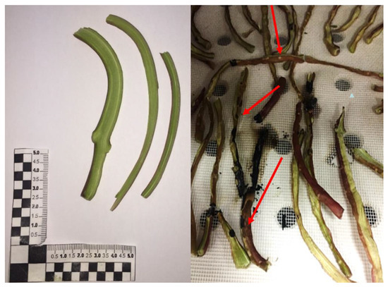 Purslane fresh-cut twigs (on the left); burned purslane twigs after preliminary drying test at 2.3 kW (on the right). The red arrows indicate the burn effects due to dissipation mechanisms.