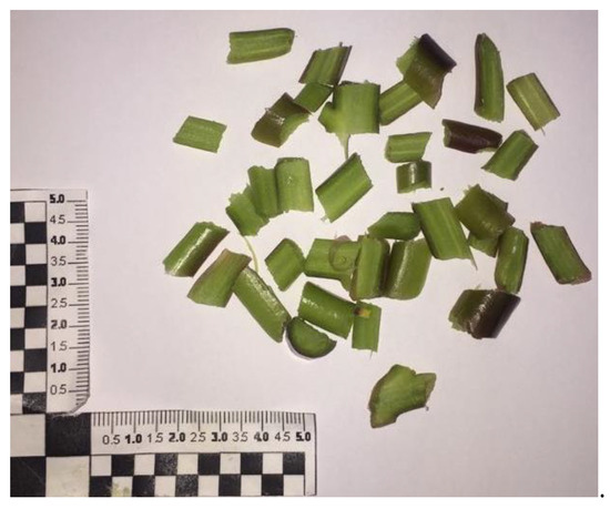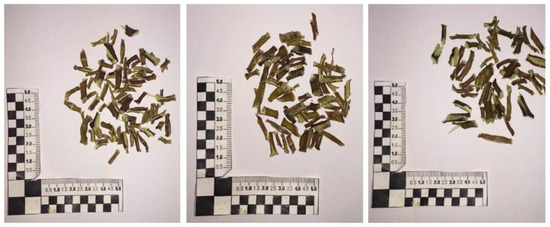 This behavior did not surprise us; due to high humidity and mineral contents, the purslane branches have highly interacted with the electromagnetic field. Also, the effect of conductivity ions contributed to heat dissipation, and all this, along with the impossibility to quickly exchange the heat to the external environment, allowed for a sudden and localized increase in temperature and, in turn, burns. To promote faster external heat exchanges and thus avoid hotspot formation, purslane branches have been cut into small pieces (see Figure 9) to increase the samples’ superficial areas and thus heat and mass transport phenomena with their surroundings. In this way, the microwave treatments at different the three operative conditions have been successfully performed.