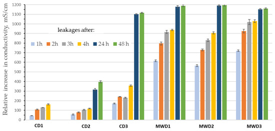 Cracking and puffing are the more diffuse effects encountered in vegetables, including in herbs dried by microwave-assisted treatments. Previous investigations [53,54,55] have demonstrated that these effects are attributable to the high rate of mass (liquid and vapor phases) transfer through the cell walls induced by the dielectric heating. A measure of structural damage after thermal stress can be evaluated through a conductometric assessment of the ionic conductivity. The efflux of substances from plants tissues submerged in liquid is widely used as a measure of vegetal membrane permeability [55,56]. Also, for the purslane dried samples, possible tissue alterations/ruptures have been investigated by an electrolyte loss determination method as previously performed for aromatic herbs [57,58,59]. In Figure 11, the electrical conductivities of the distilled water batch with purslane dried samples as a function of time are reported.