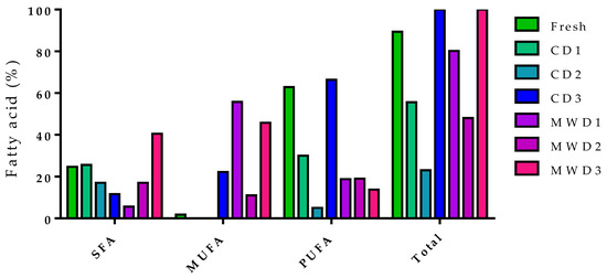 Dielectric heating had a different impact on dried samples depending on the used power output, i.e., temperature–time conditions. In MWD1 and MWD3, fatty acids were the most abundant class of components, while in MWD2 fatty acids, they represented only 48% (Figure 12); the remainder was represented by sterols, in particular by γ-sitosterol (16.2%) and β-sitosterol (20.7%). These latter compounds were absent in MWD3 samples and were present in smaller quantities in MWD1. In fact, MWD1 was mainly characterized by oleic (54.12%) and linoleic acids (15%), while MWD3 was characterized by oleic (44.9%) and palmitic acids (17.6%). The reduced presence of α-linolenic acid compared with samples dried with convective methods agrees with the literature data [16,62]. MDW1 dried samples were subjected to the shortest treatment time at the highest temperature; the dried MDW3 samples were exposed to the lowest temperature range but for more prolonged times.