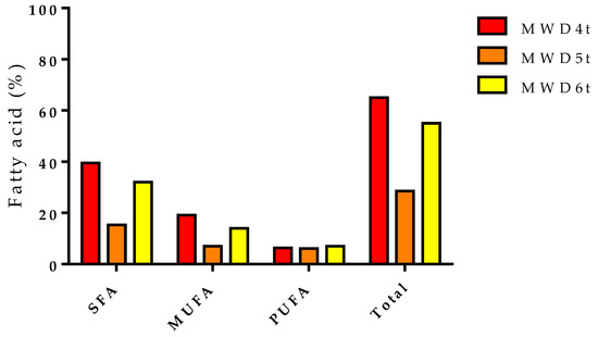 Table 5 summarizes the characterizations of the twig samples dried by microwave protocols. The phytochemical analysis showed how, again, as for the apical purslane parts, the applied exposure conditions influenced the chemical composition. In MWD4t, fatty acids constituted 65%, where SFAs were the most abundant (39.5%), while MUFAs and PUFAs represented 19.1 and 6.4%, respectively (Figure 13). The saturated fatty acid that mainly characterized MWD4t was stearic acid (22.3%), while among the unsaturated fats, the most abundant was oleic acid (18.2%). In addition to fatty acids, phytosterols such as γ-sitosterol and β-sitosterol and triterpenes such as lupeol and botulin have been identified. In MWD5t, fatty acids represented only 28.5%, with stearic acid being the most abundant fatty acid (7.1%). In this case, the main components were octacosanol (14.8%) and β-sitosterol (28.9%); moreover, among triterpenes, α-amyrin was identified (5.7%). As far as MWD6t is concerned, however, among the various treatments, it is the one that has the greatest amounts of PUFAs (7.7%) compared with MWD5t (6.1%) and MWD4t (6.4%) due to the greater presence of α-linolenic acid (4.3%). Other fatty acids that characterized this sample were stearic (19.5%) and oleic acids (14.8%), while among the phytosterols, the main ones were γ-sitosterol and β-sitosterol (3.9 and 12.2%, respectively). Lupeol (9.1%) and α- (0.1%) and β-amyrin (2.3%) have been identified among triterpenes. No phytochemical literature data on the purslane twigs are available.