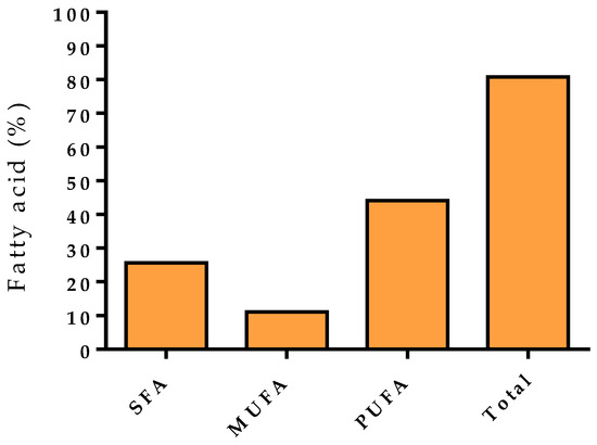 The drying process affected the chemical composition of the raw material (Table 4). The fresh sample was mainly characterized by fatty acids, which represented almost 90% of the extract (Figure 12). The major class of fatty acids were polyunsaturated fatty acids—PUFAs—(62.9%), followed by saturated fatty acids—SFAs—(24.7%), and finally monounsaturated fatty acids—MUFAs—(1.8%). The main component of the fresh plant extract was cervonic acid (58.9%). This compound was also reported by [61]. The second most abundant compound was palmitic acid, a saturated fatty acid, at 18.8%. In addition to fatty acids, phytosterols such as γ-sitosterol and β-sitosterol (2.4 and 0.7%, respectively) have also been identified.