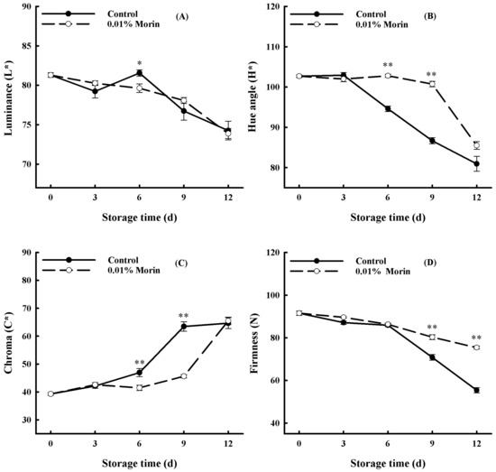 3.1. The 0.01% Morin Treatment Could Delay the Quality Deterioration of Postharvest Mango Fruits Stored at Ambient Temperature