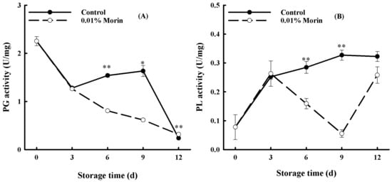 3.3. The 0.01% Morin Treatment Could Retard the Softening of Mango Fruits by Suppressing Cell Wall-Degrading Enzyme Activities