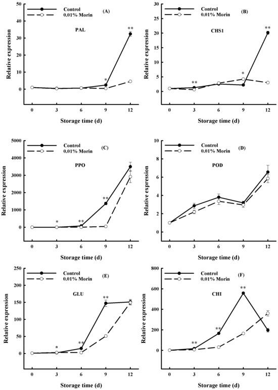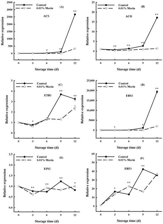 3.4. The 0.01% Morin Treatment Might Prolong the Storage Period of Mango Fruits by Delaying the Expression of Ripening-Related Genes