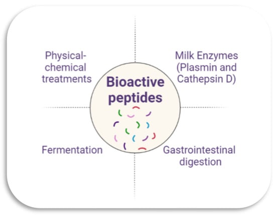 These peptides are present in the primary structure of milk proteins. They remain inactive until their release by different mechanisms (Figure 1), such as through the proteolysis of caseins and whey proteins (β-lactoglobulin, α-lactalbumin, serum albumin, immunoglobulins, lactoferrin, and protease–peptone fractions) through physical and chemical treatments (thermal treatment, homogenization, application of pressure, and milk coagulation) [2,11,21]. They can also be released by gastrointestinal digestion, enzymatic hydrolysis by the action of plasmin and cathepsin D present in milk, and through microbial fermentation [21]. Naturally occurring lactic acid bacteria in milk are primarily responsible for the proteolysis that results in forming bioactive peptides [11].